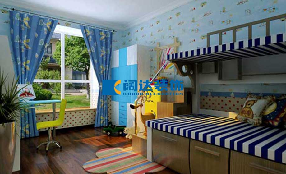 兒童房:以天藍色的整體色調和實木家具的搭配,給孩子營造出健康陽光的休閑和學習空間。