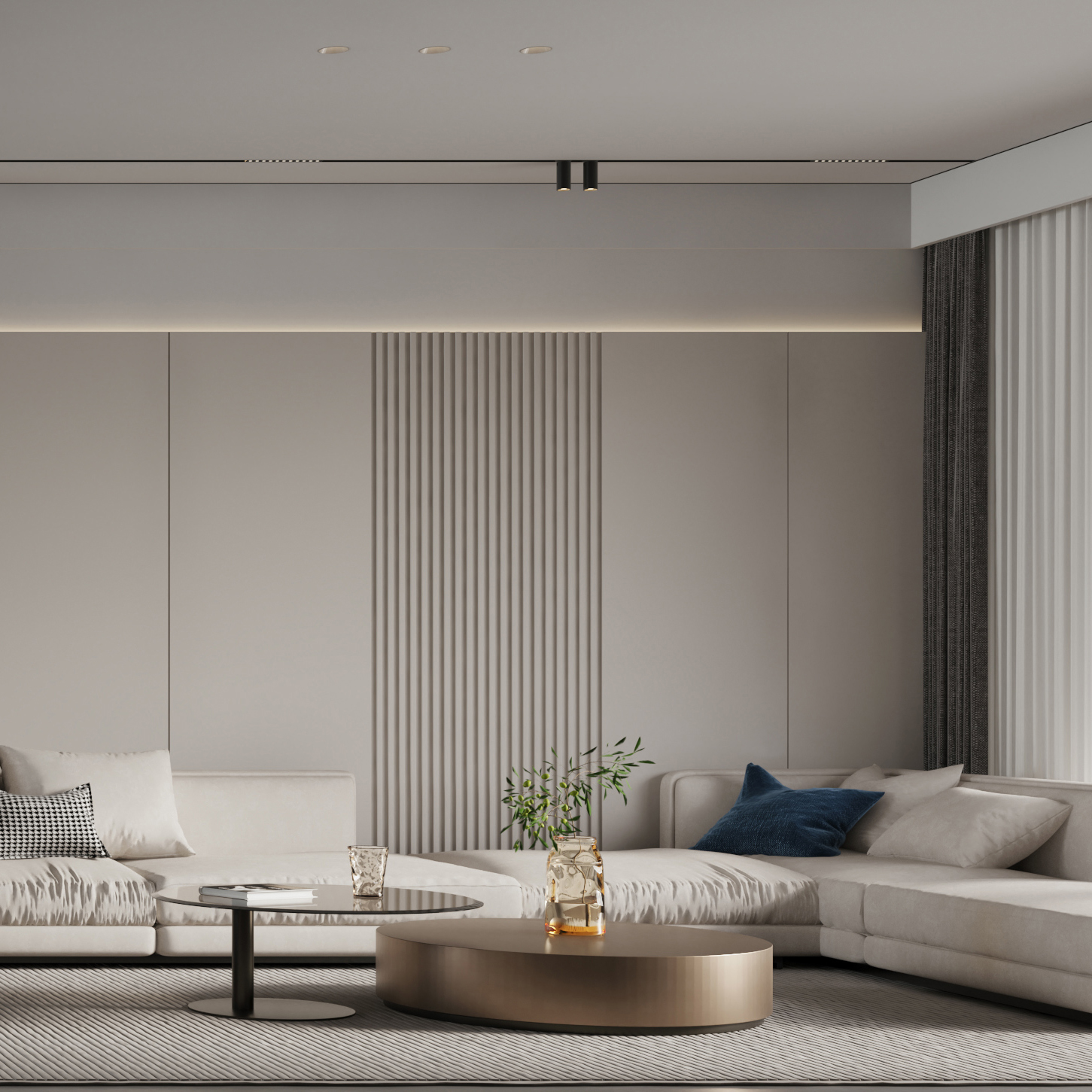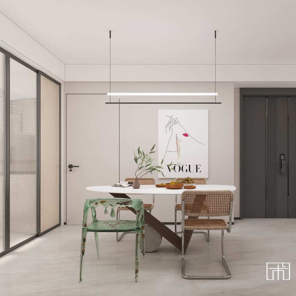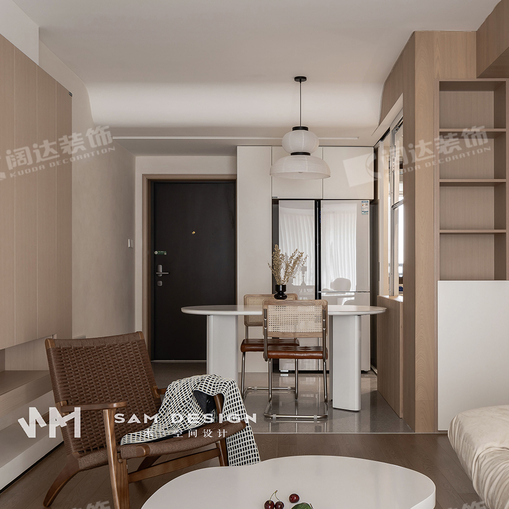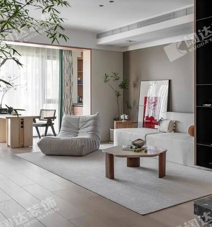 沙發茶幾地毯居中,給在此間的人足以縱覽全屋的視角,又可將窗外風景盡收眼底,臨摹生活最舒適自在的場景。