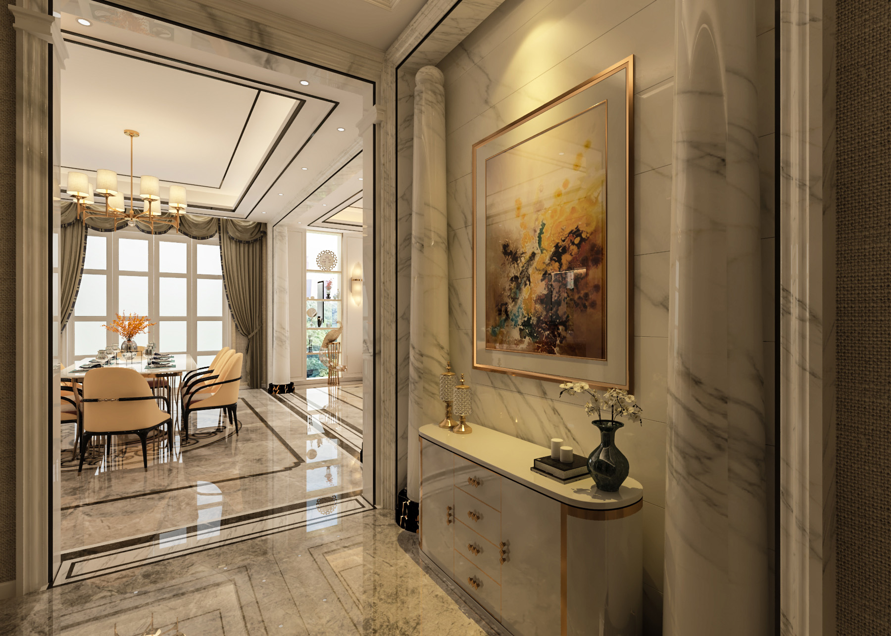 簡(jiǎn)歐帶著一點(diǎn)輕奢的感覺(jué),整個(gè)公共空間線條硬朗,材質(zhì)感比較強(qiáng),私密空間一溫馨舒適為主。同風(fēng)格案例:更多>>