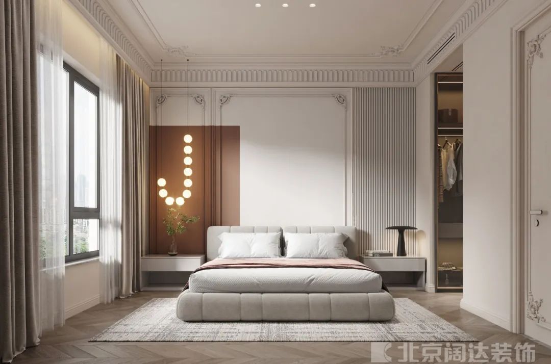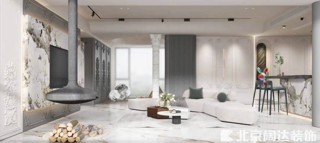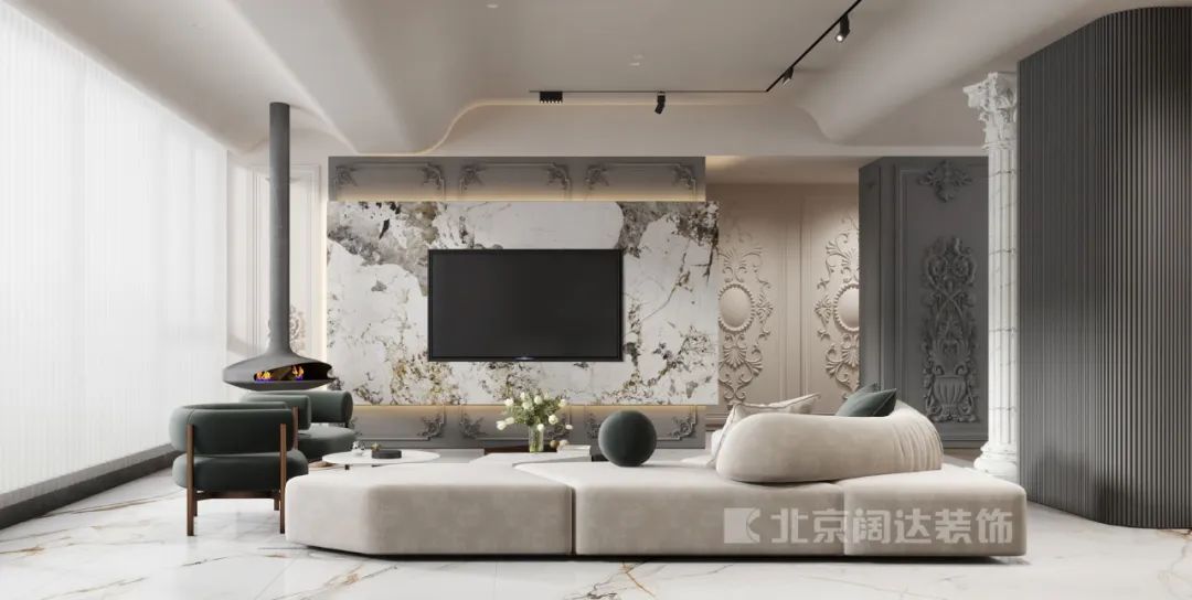 嵌入式設(shè)計(jì)的電視背景墻,結(jié)合巖板和法式線條護(hù)墻板,懸掛壁爐浪漫又不失質(zhì)感,既保留了法式的柔和,也融入了現(xiàn)代的大氣。圓弧形的吊頂上,嵌入式無(wú)主燈散落在“星盤(pán)”里,給予生活最自然浪漫的光影支持。