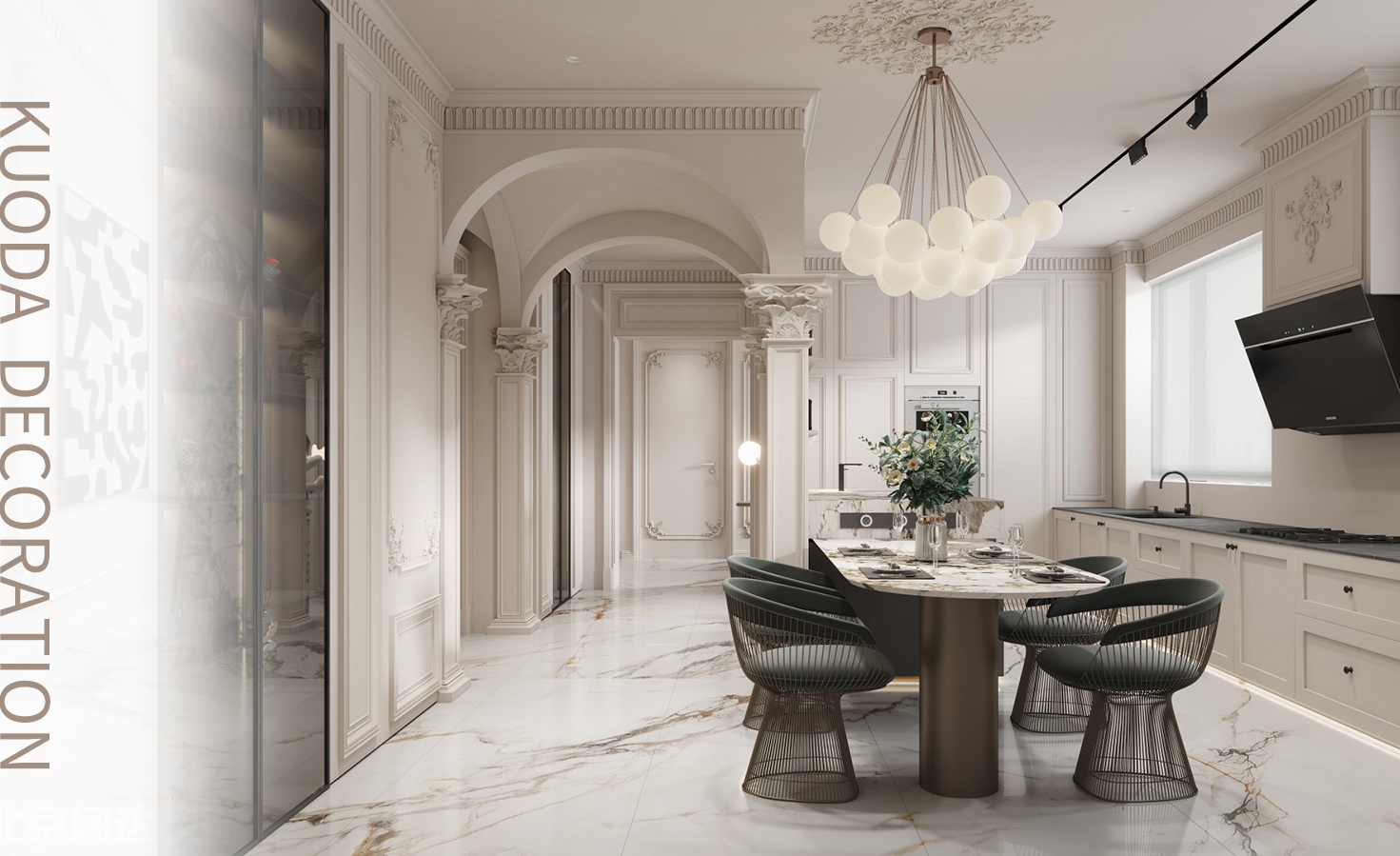 人間浪漫不過(guò)日出東方。把日出定格家中,一餐一食,皆溫柔。延續(xù)客廳的浪漫基調(diào),復(fù)古的壁畫(huà)為餐廳融入美好氛圍感;絲絨與羊羔絨餐椅將法式的優(yōu)雅完美表達(dá)。在功能上,增加島臺(tái)與餐邊柜,安裝小水槽和直飲機(jī),縮短生活動(dòng)線,提升家居舒適度。