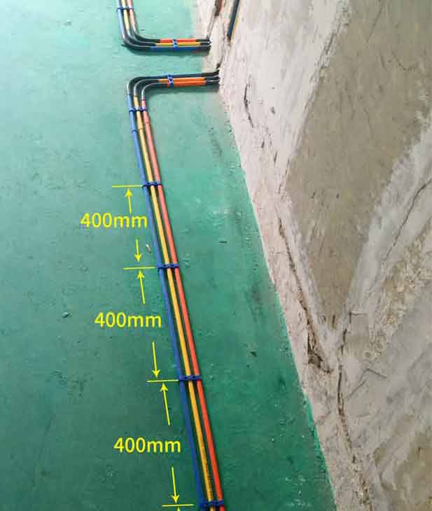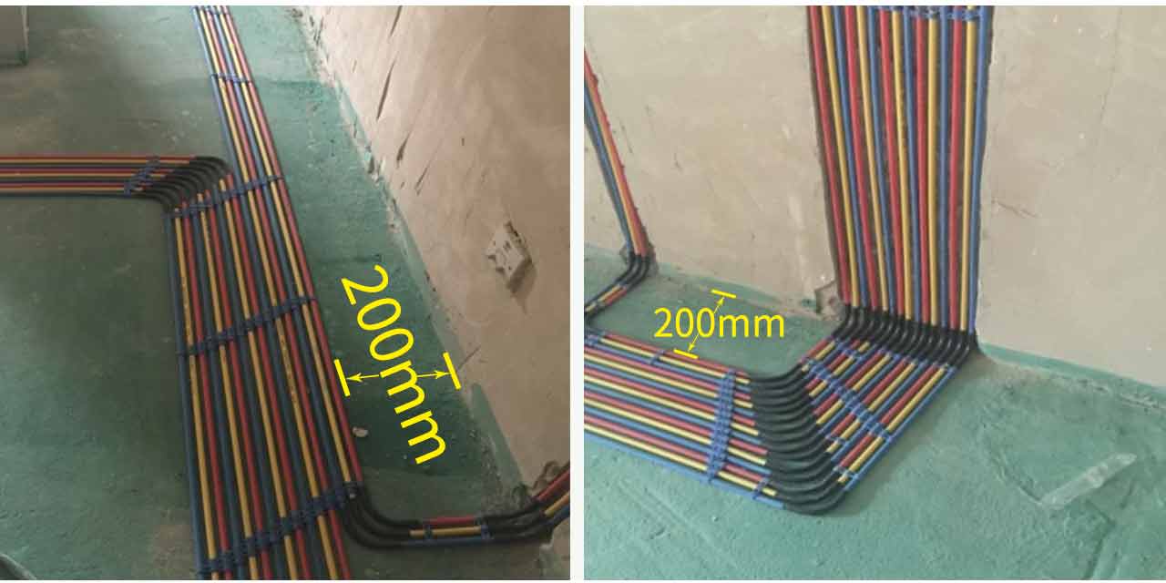 單管單線施工工藝地面配管必須使用10(mm)PVC阻燃線管(公司專利材料),并距墻體200mm間距沿墻敷設,多根管敷設時,必須并行、整齊排列,盡量減少管線的交叉和重疊。